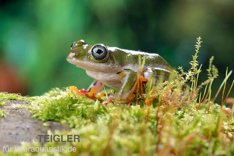 Der Afrikanische Riedfrosch ist in weiten Teilen West- und Zentralafrikas verbreitet und bewohnt dort feuchttropische Savannen, Randzonen von Wäldern, Sümpfe und Reisfelder. Er ist ein typischer Bewohner wasserreicher Habitate mit dichter Vegetation, in denen er sowohl auf dem Land als auch im Wasser zurechtkommt. Die Art zeigt ein faszinierendes Farbspiel, das von Grün über Oliv bis zu Gelbtönen reichen kann, oft ergänzt durch leuchtend orangefarbene Zehen. Seine glatte Haut und die großen Kletterzehen mit Haftscheiben machen ihn zu einem flinken Kletterer, der auch an senkrechtem Glas laufen kann – eine Fähigkeit, die ihn im Terrarium besonders spannend macht. Als dämmerungs- und nachtaktives Tier verbringt er die Tagesstunden ruhend in dichter Vegetation und wird erst bei einsetzender Dunkelheit aktiv.