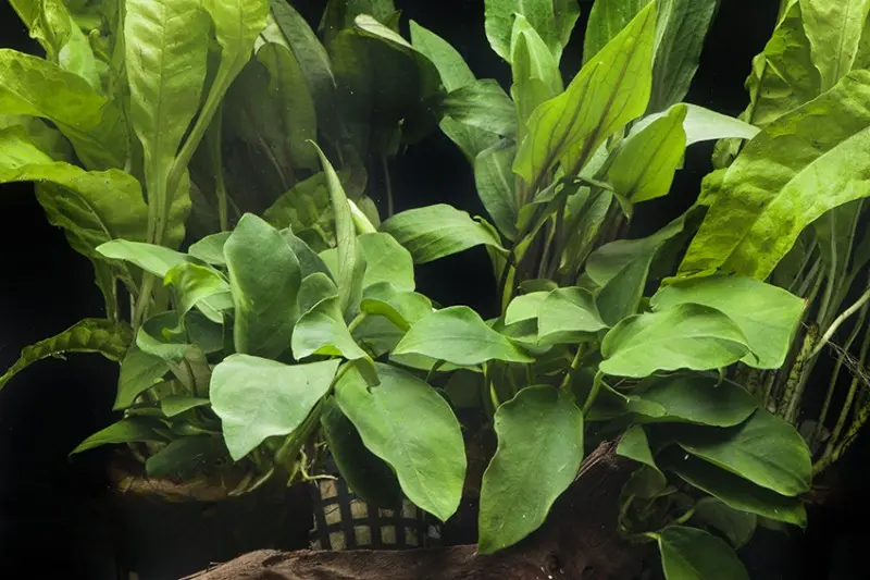 - 2 x Anubias sp. – Aufsitzerpflanzen mit festen, dunkelgrünen Blättern