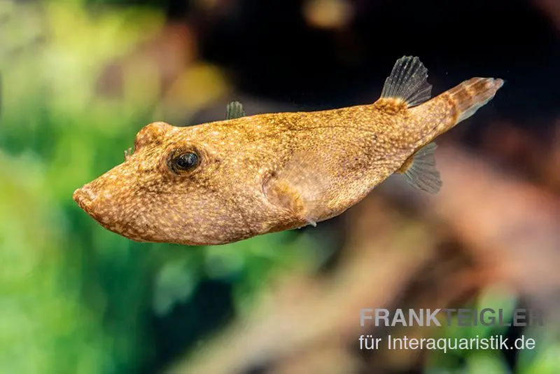 Der Braune Kugelfisch (Tetraodon miurus) stammt aus dem Kongobecken in Zentralafrika, wo er in schlammigen, langsam fließenden Flussabschnitten mit hohem Pflanzen- und Wurzelanteil vorkommt. Diese Art ist perfekt an eine bodenorientierte Lebensweise angepasst: In der Natur lauert er halbeingraben im Sand auf vorbeiziehende Beute. Seine auffällige Färbung reicht von rötlichbraun bis fast schwarz, mit marmorierter Zeichnung oder feinen Flecken. Im Aquarium beeindruckt Tetraodon miurus durch sein ungewöhnliches Verhalten und seine hohe Intelligenz – er beobachtet aktiv seine Umgebung und reagiert sichtbar auf Futter und Halter.