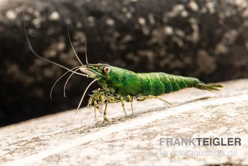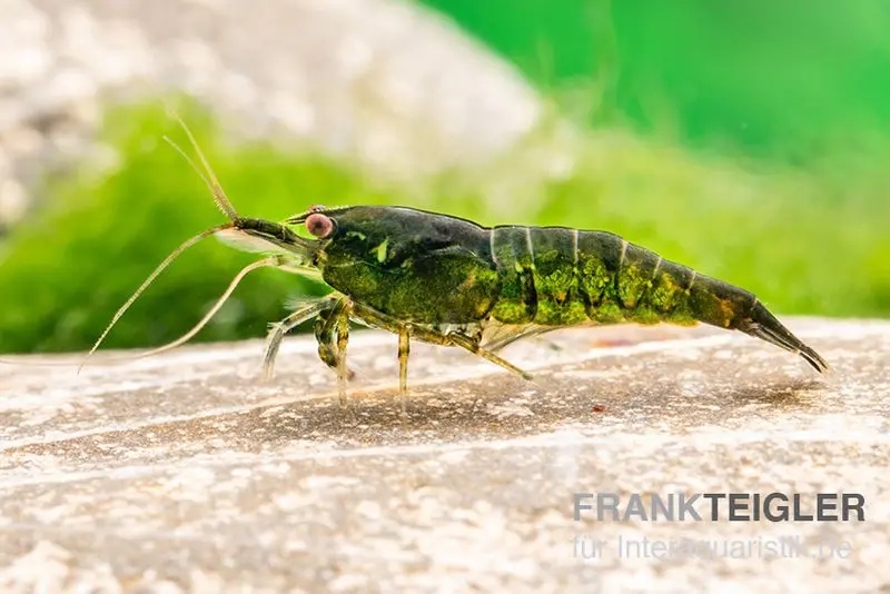 Weibliche Dark Green Shrimp sind etwas größer als die Männchen und haben oft eine kräftigere Färbung. Außerdem besitzen sie einen gut sichtbaren Eifleck und einen fülligeren Hinterleib.
