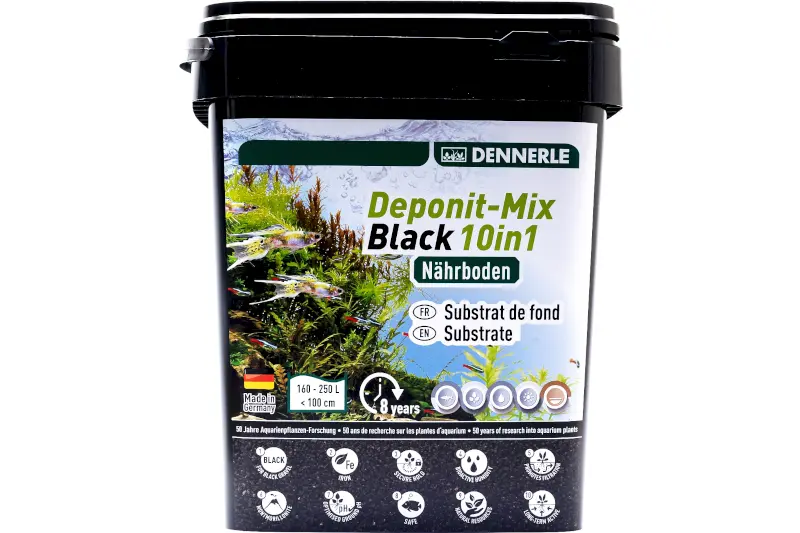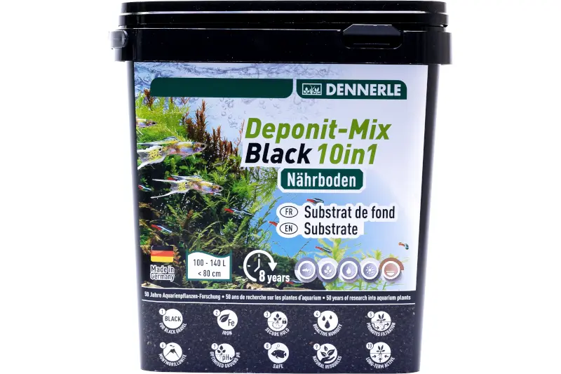 Der Dennerle Deponit-Mix Black 10in1 ist ein hochwertiger, mineralisch-organischer Nährboden mit natürlichem Schwarzerde-Look – speziell entwickelt für anspruchsvoll bepflanzte Aquarien. Die Kombination aus Eisen, Kalium, Magnesium, Tonmineralen und organischem Hochmoortorf sorgt für kräftigen Pflanzenwuchs, stabile Wasserwerte und ein gesundes Bodenmilieu. Die 10-fach-Wirkformel garantiert eine langanhaltende Versorgung der Wurzeln – ganz ohne Nachdüngung im Bodengrund.