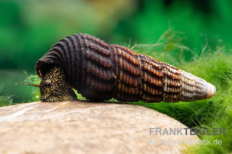 Die Goldpunkt-Towutischnecke, wissenschaftlich Tylomelania towutensis, stammt aus dem Towuti-See auf der indonesischen Insel Sulawesi. Sie gehört zur Familie der Pachychilidae und wird manchmal als "Towuti-Turmdeckelschnecke" bezeichnet. Der Towuti-See ist ein nährstoffarmes, klares Gewässer mit felsigen und sandigen Ufern, in denen die Schnecke bevorzugt lebt. Optisch ist sie durch ihr markantes, dunkelbraunes bis schwarzes, spiralig geriffeltes Gehäuse mit hellerem Apex und den auffälligen goldgelben Punkten auf ihrem dunklen Körper sofort zu erkennen. Diese Farbkontraste machen sie zu einem besonderen Blickfang im Aquarium.