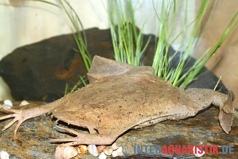 Für die Haltung der Großen Wabenkröte ist ein reines Aquarium erforderlich, ein Landbereich wird nicht benötigt. Ein Becken mit mindestens 80x40x40 cm bietet genügend Platz für eine kleine Gruppe. Der Bodengrund sollte aus feinem Sand oder weichem Kies bestehen, um Verletzungen der sensiblen Haut zu vermeiden. Das Wasser sollte ruhig sein, da starke Strömungen die Tiere stressen. Die idealen Wasserwerte für die Große Wabenkröte liegen bei einem pH-Wert von 6,0 - 7,5 und einer Gesamthärte im Bereich von weich bis mittelhart. Die Wassertemperatur sollte zwischen 24-28° C liegen.