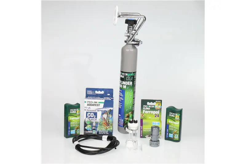 - Lieferumfang: 500 g Mehrweg CO2-Flasche mit Wandhalterung, Druckminderer, 3 m Schlauch, Blasenzähler mit Rückschlagventil, Keramikdiffusor, Dauertest mit Reagenzien, 2x Pflanzendünger 100 ml, 1x Tagesdünger 10 ml