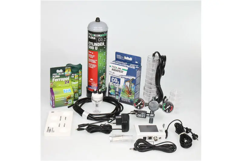 - Lieferumfang: 500 g Einweg CO2-Flasche, Druckminderer mit Magnetventil, CO2/pH-Computer, 3 m Schlauch, Blasenzähler mit Rückschlagventil, TAIFUN CO2 Reaktor mit Erweiterungsset, 2x Pflanzendünger 100 ml, 1x Tagesdünger 10 ml