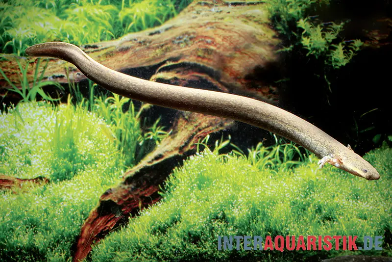 Für die artgerechte Haltung ist ein gut strukturiertes Aquaterrarium ohne Landteil erforderlich. Eine Mindestgröße von 80x40x40 cm ist für ein Einzeltier empfehlenswert, bei Gruppen sollte das Becken deutlich größer ausfallen. Besonders wichtig ist ein feiner Sandboden, in den sich der Armmolch eingraben kann. Wurzeln, Steine, Tonhöhlen und Laub sorgen für Rückzugsorte. Da die Tiere eher dämmerungsaktiv sind, sollte das Aquarium nicht zu grell beleuchtet sein – diffuse LED-Beleuchtung ist völlig ausreichend. Ein gedämpfter Wasserfluss mit Filterung über einen Schwamm- oder Hamburger Mattenfilter vermeidet zu starke Strömung. Eine Abdeckung ist Pflicht, da die Tiere gelegentlich versuchen können, sich durch kleinste Öffnungen zu zwängen.