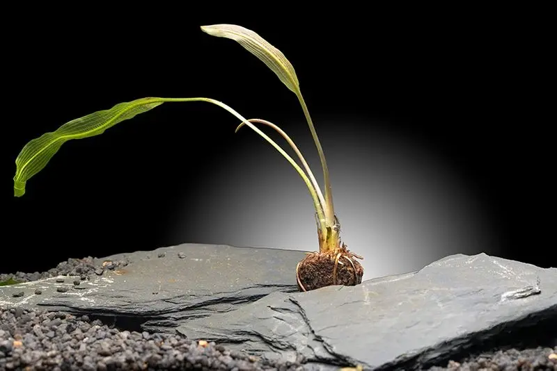 Der Madagaskar-Aponogeton wird als Knolle geliefert. Vor dem Einsetzen ins Aquarium sollte die Knolle gründlich abgespült werden, um Rückstände zu entfernen. Ein nährstoffreicher Bodengrund fördert das Anwachsen und die Bildung erster Blätter.