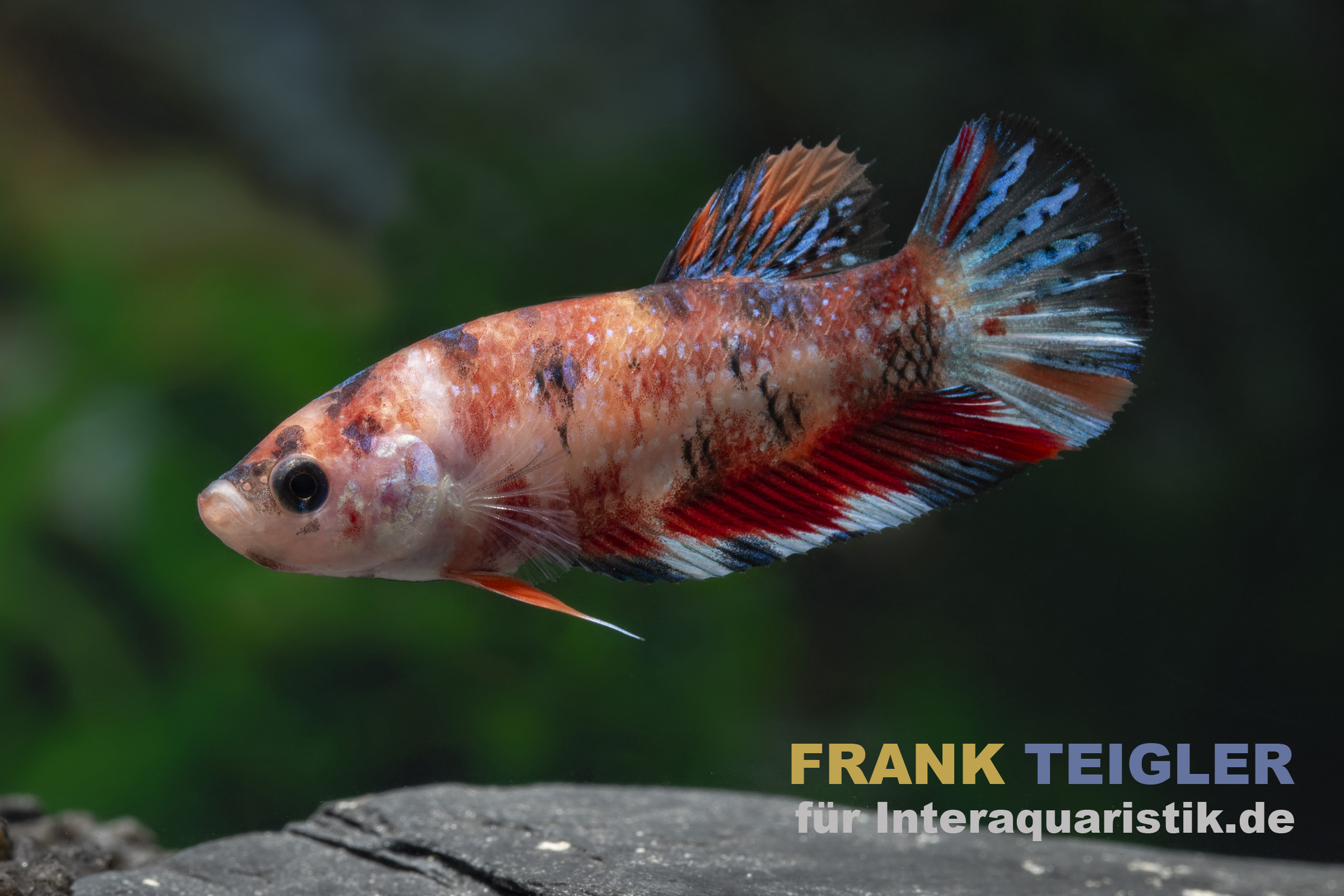 Der Plakat Kampffisch Candy, wissenschaftlich Betta splendens, stammt aus den Reisfeldern, Tümpeln und langsam fließenden Gewässern Südostasiens. Diese Zuchtform wurde speziell für ihre kräftigen Farben und die kürzeren, robusteren Flossen gezüchtet.