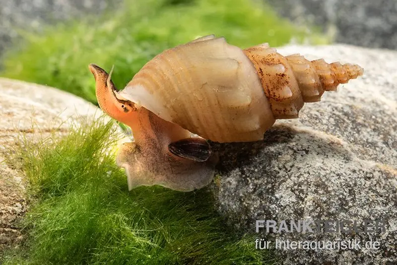 Ein Becken ab 30 Litern ist ausreichend. Es sollte mit feinem Sand oder weichem Kies ausgestattet sein, um das natürliche Grabbverhalten der Schnecke zu ermöglichen. Wurzeln und Steine bieten zusätzliche Versteckmöglichkeiten.