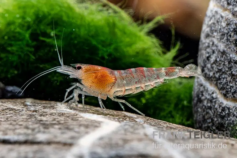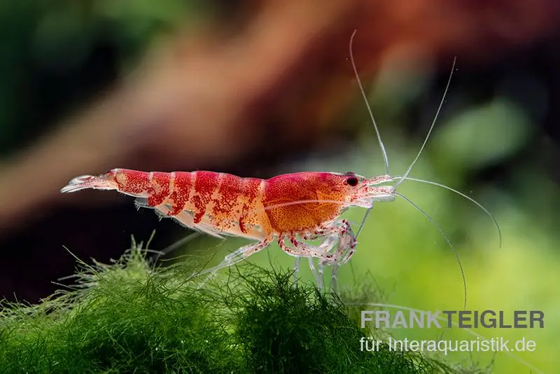 Die Rote Tigergarnele gehört zur Familie der Süßwassergarnelen und stammt ursprünglich aus Südchina. Ihr charakteristisches Muster mit roten Streifen auf einem hellen Körper macht sie zu einem besonderen Hingucker in Garnelenaquarien. Durch gezielte Zucht hat sich die Farbvariante "Red" entwickelt, die besonders intensiv leuchtet.
