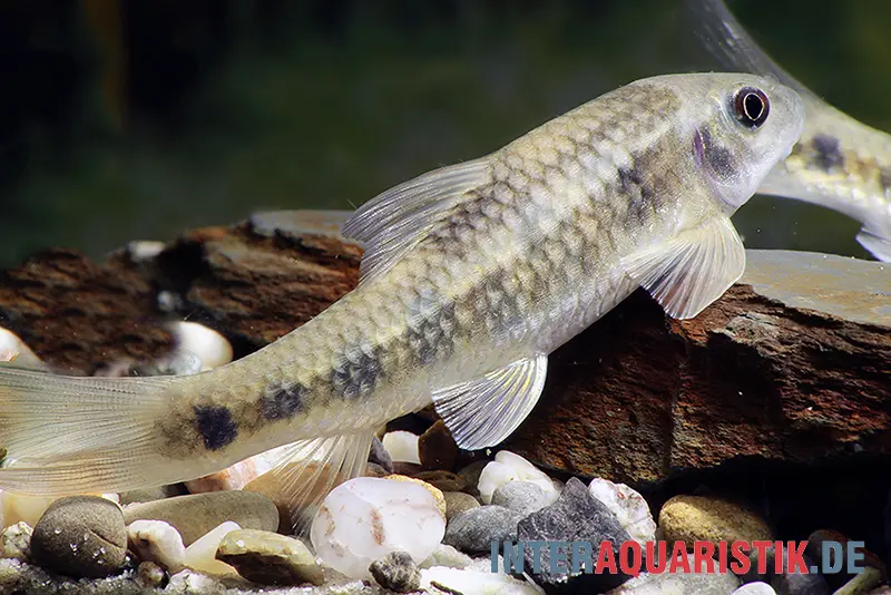 Für ausgewachsene Tiere ist ein Aquarium ab 80 cm Kantenlänge sinnvoll. Entscheidend ist eine strukturierte Einrichtung mit Steinen, Wurzeln und klaren Strömungszonen. Ein sandig-feiner Kiesboden verhindert Verletzungen beim Absuchen des Bodens. Freie Strömungskorridore wechseln sich idealerweise mit ruhigeren Zonen ab, sodass die Tiere aktiv, aber stressfrei leben können.