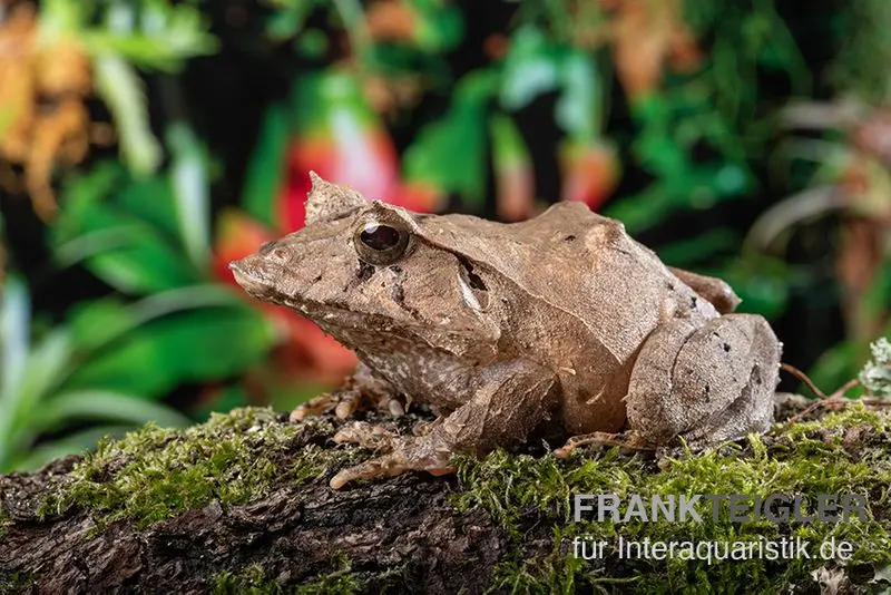 Der Salomonen-Zipfelfrosch lebt gut getarnt am Boden der tropischen Regenwälder der Salomoneninseln. Dort bewohnt er feuchte Laubschichten, Mulden und moosige Bodensenken, in denen er nahezu unsichtbar wird. Die eigenartige Kopfform mit auffälligen zipfelförmigen Fortsätzen über den Augen, kombiniert mit seiner bräunlichen Färbung, lässt ihn wie ein abgefallenes Blatt wirken. Er verbringt den Tag regungslos am Boden verborgen, wird aber in der Dämmerung aktiv. Obwohl er zu den eher ruhigen Arten zählt, kann er blitzschnell zuschnappen, wenn Beute in Reichweite kommt. Besonders spannend: Diese Art zeigt ein erstaunlich gutes Reaktionsvermögen und kann bei Störung kurze Sprünge vollführen. Aufgrund seiner Tarnung wird er in der Natur oft übersehen, obwohl er relativ häufig vorkommt.