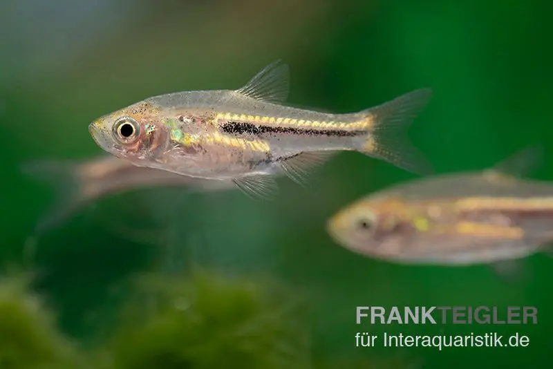 Optisch wirkt der Zwergbärbling äußerst filigran: Der schlanke, nahezu transparente Körper wird von einer feinen, warm orangefarbenen Linie durchzogen, die sich je nach Lichteinfall unterschiedlich intensiv zeigt. Besonders in ruhigen, gut bepflanzten Aquarien schimmert diese Zeichnung dezent, aber sehr elegant. Das Verhalten ist ruhig, vorsichtig und stark gruppenorientiert. Die Tiere bewegen sich meist in lockeren Schwärmen durch die mittleren Wasserzonen und vermitteln dabei ein sehr harmonisches, beinahe schwebendes Gesamtbild.