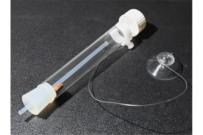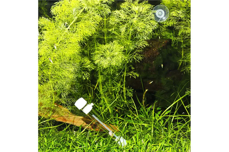 4. Platzieren Sie die Falle am Boden in Ihrem Aquarium. Das Eingangsröhrchen sollte leichten Kontakt mit der Aquarienscheibe haben oder so platziert sein, dass es einen Stein oder eine Pflanze berührt. Der Kontakt zu einem Gegenstand erleichtert den Planarien den Eingang in die Falle. Die schräge Platzierung hat sich als Vorteilhaft erwiesen. Die Falle wird mit einem Faden und einem Saugnapf ausgeliefert um Ihnen die Platzierung zu erleichtern und die Falle an Ort und Stelle zu halten.