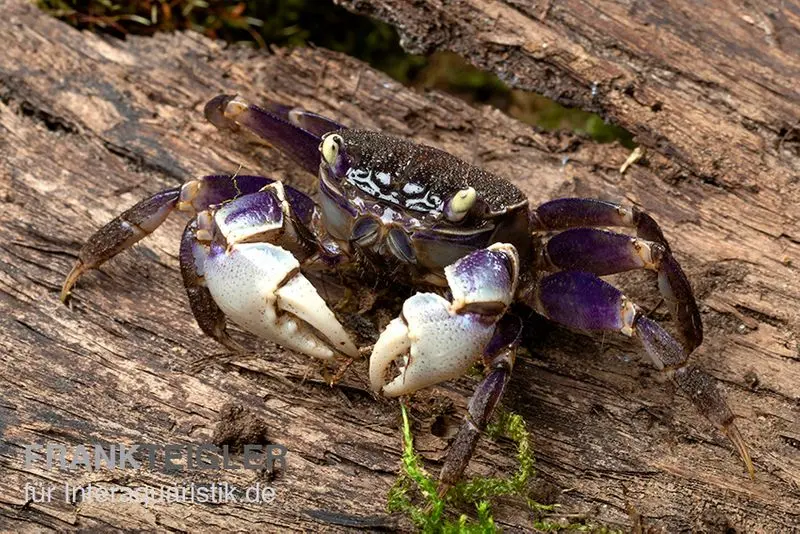 Diese auffällige Krabbe bewohnt die schlammigen Uferbereiche der Mangrovenregionen in Ostafrika und Madagaskar. Dort lebt sie in selbst gegrabenen Höhlen, die sie bei Flut mit Wasser füllt. In ihrer natürlichen Umgebung ist sie ein geschickter Kletterer, der oft an Wurzeln oder im Geäst zu finden ist. Besonders charakteristisch sind ihre bläulich-violetten Scheren und die kontrastreiche Musterung des Panzers. Sie ist überwiegend dämmerungsaktiv und verbringt den Tag versteckt in ihrer Höhle.