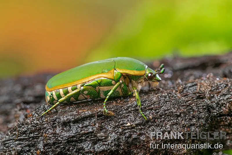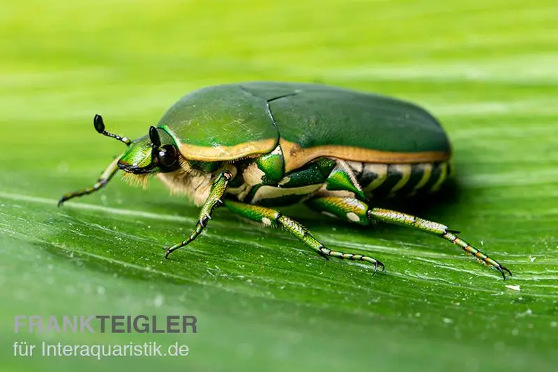 Bei dem Grünen Afrika-Rosenkäfer mit der wissenschaftliche Bezeichnung Pachnoda prasina handelt es sich um eine optisch ansprechende Käfer-Art aus der Familie der Scarabaeidae (Blatthornkäfer). Dieses wunderschöne Insekt stammt ursprünglich aus dem afrikanischen Raum. Insbesondere in Guinea, Kongo, Sudan oder Nigeria ist der Pachnoda prasina weit verbreitet. Dort ist der tagaktive Käfer vermehrt auf Bäumen oder Sträuchern anzutreffen und ernährt sich weitestgehend von Blütenblättern und den Säften von Früchten. Bei dem Grünen Afrika-Rosenkäfer ist der Name noch Programm. Die Tiere besitzen eine markante grünliche Panzerfärbung.