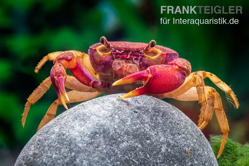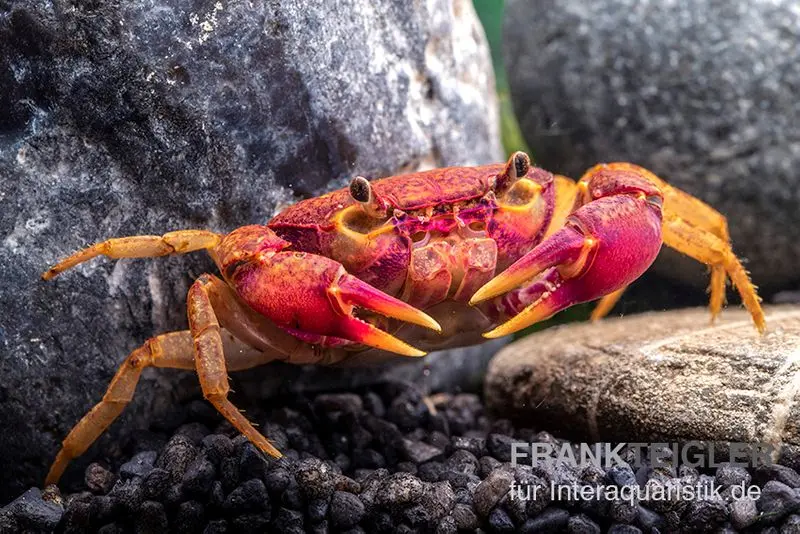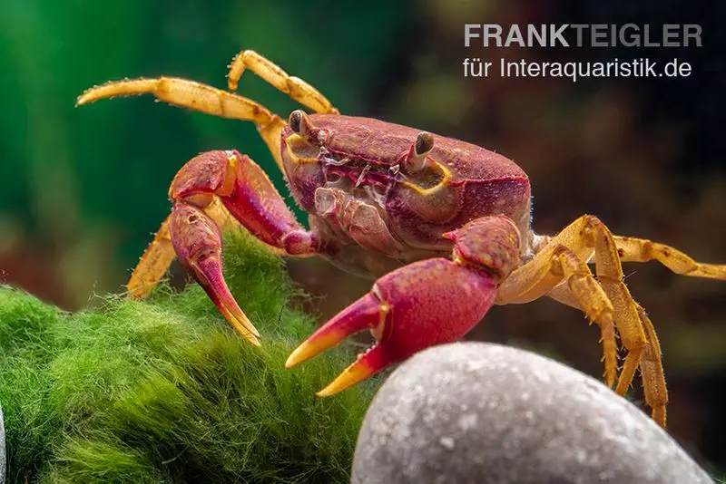 Diese faszinierende Süßwasserkrabbe stammt aus den klaren Flüssen Indiens, wo sie sich bevorzugt zwischen Steinen und im Wurzelgeflecht verbirgt. Anders als viele andere Krabbenarten ist sie vollständig aquatisch und benötigt keine Landbereiche. Ihre violette bis lilafarbene Schalenfärbung macht sie zu einem außergewöhnlichen Blickfang im Aquarium. Sie ist sowohl tagsüber als auch in der Dämmerung aktiv und zeigt ein interessantes, neugieriges Verhalten.