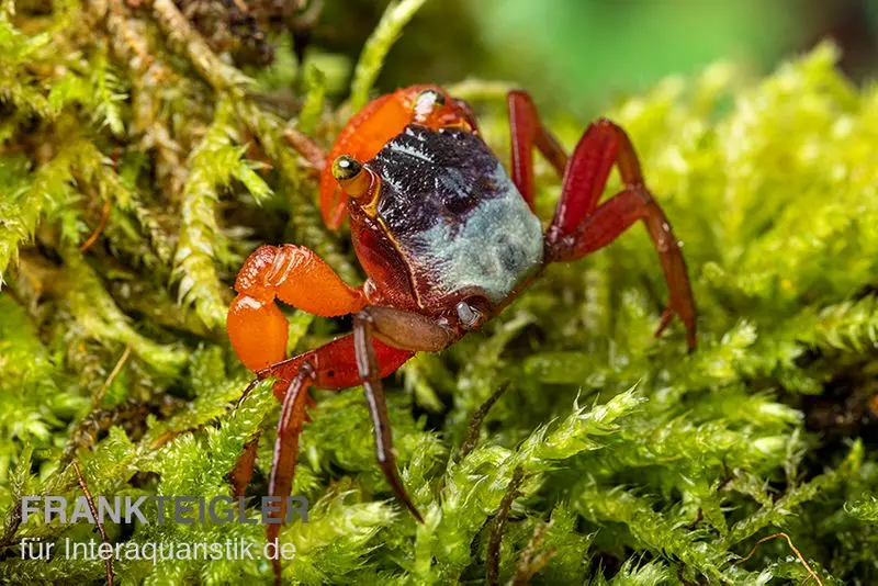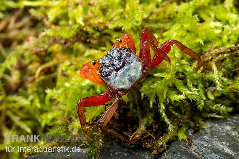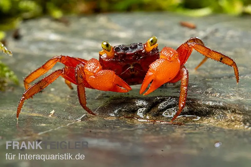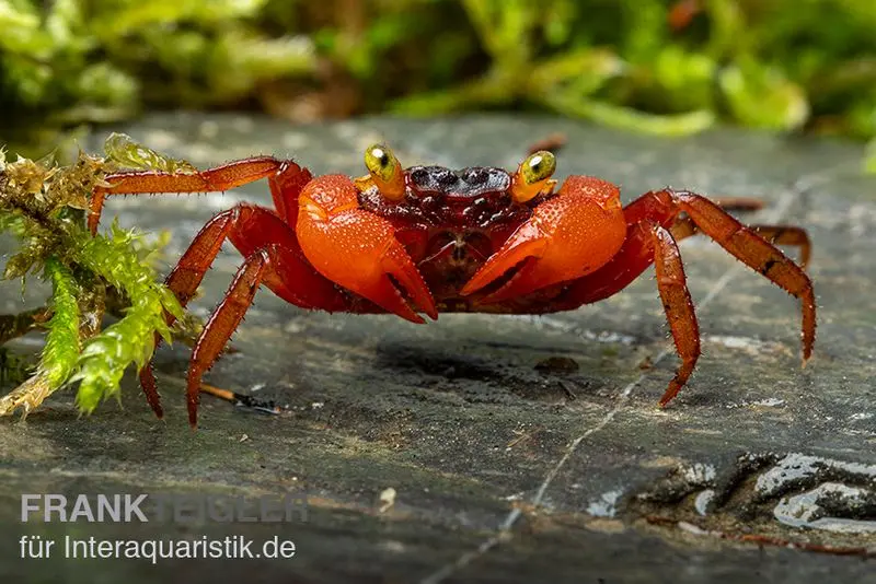 Die Mandarinenkrabbe stammt aus den feuchtwarmen Regenwäldern Südostasiens, wo sie sich in Laubstreu, unter Wurzeln und zwischen feuchten Steinen versteckt. Die Mandarinenkrabbe gehört zur Gattung Geosesarma und zählt damit zu den sogenannten Vampirkrabben. Diese farbenprächtige Krabbe mit ihrer leuchtend orange-roten Färbung und dem dunklen Rückenpanzer ist vor allem nachtaktiv und erkundet in der Dämmerung ihr Revier. Sie lebt größtenteils an Land, benötigt aber immer eine flache Wasserstelle zur Feuchtigkeitsaufnahme.