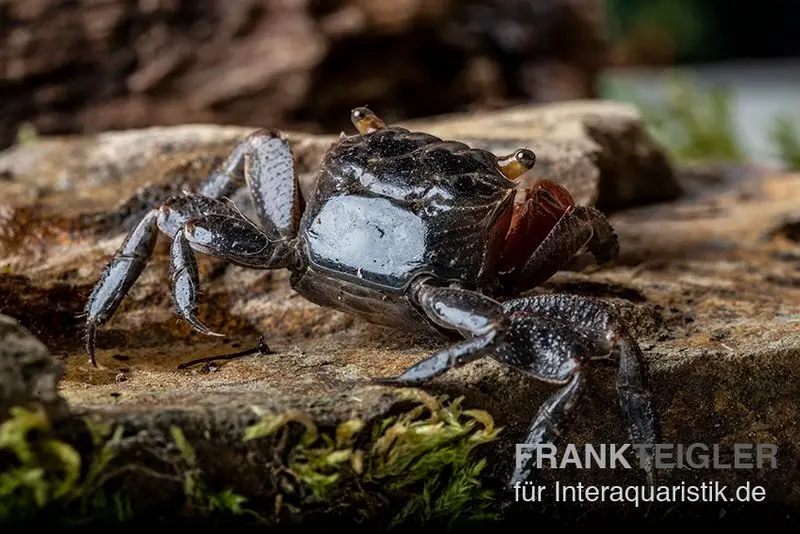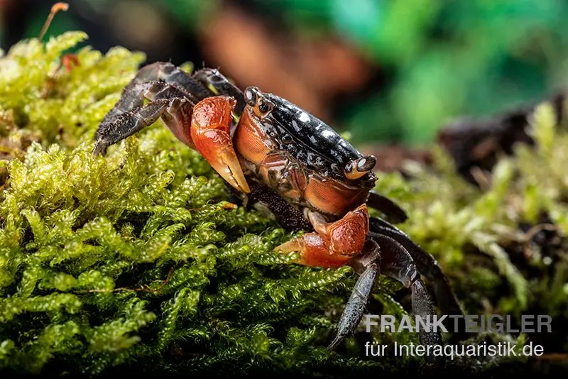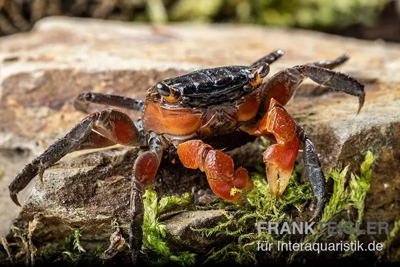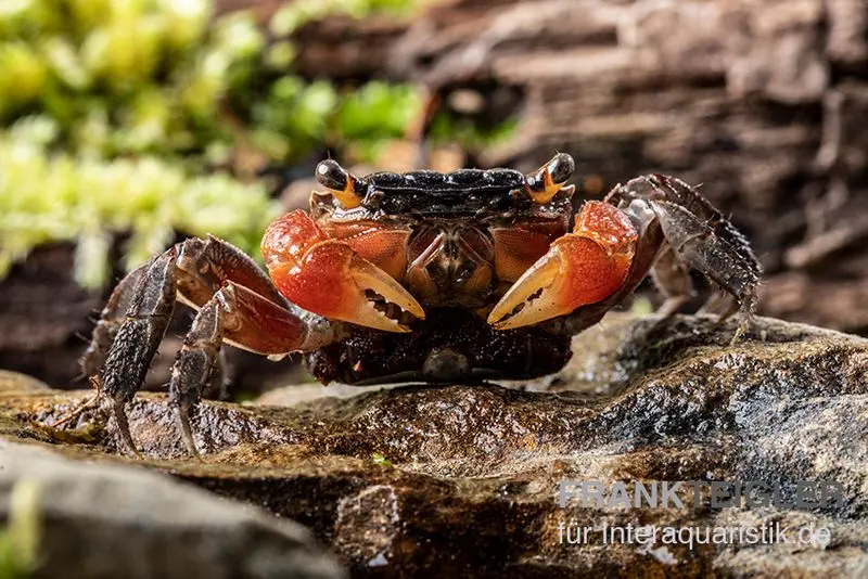 Die Rote Mangrovenkrabbe stammt aus den tropischen Mangrovenwäldern Südostasiens, wo sie in den schlammigen Uferzonen lebt. Diese Krabbe ist semi-aquatisch und verbringt den Großteil ihrer Zeit an Land, benötigt jedoch einen flachen Wasserbereich zur Häutung und Hydration. Sie ist dämmerungs- und nachtaktiv und hält sich tagsüber in feuchten Verstecken unter Holz oder Laub auf. Durch ihre kletterfreudige Natur nutzt sie Wurzeln, Äste und Steine, um ihr Habitat zu erkunden. Eine dichte Abdeckung des Paludariums ist essenziell, da sie gut klettern kann.