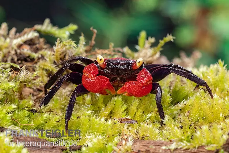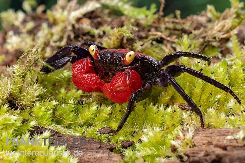 Die Rote Vampirkrabbe stammt aus den tropischen Regenwäldern Indonesiens, wo sie sich auf feuchten Waldböden und in Laubschichten versteckt. Diese kleine, auffällig gefärbte Krabbe lebt überwiegend an Land und nutzt nur kleine Wasseransammlungen zur Feuchtigkeitsaufnahme. Ihre tiefrote Panzerfärbung mit dunklen Beinen macht sie zu einem echten Blickfang. Geosesarma hagen ist dämmerungs- und nachtaktiv und verbringt den Tag in Verstecken unter Wurzeln, Steinen oder Laub. Sie ist territorial und sollte nicht mit anderen Krabbenarten vergesellschaftet werden.