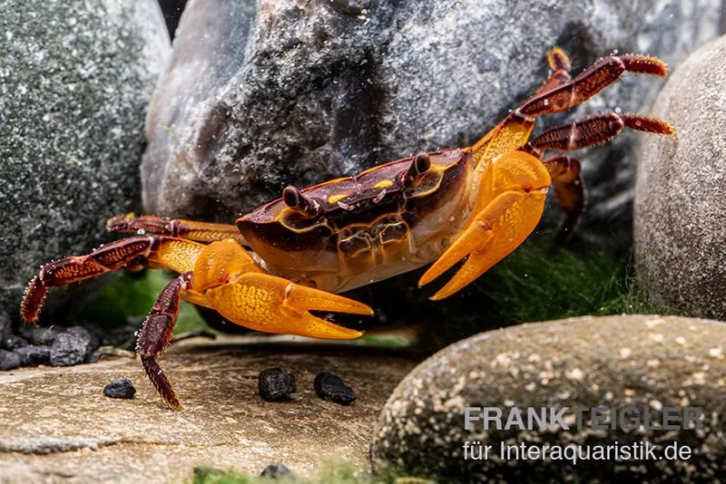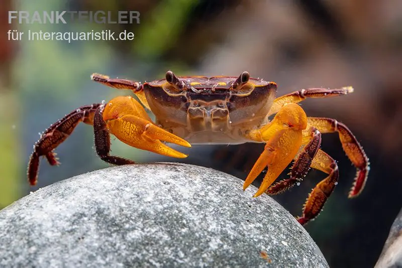 Der Name „Melonenkrabbe“ bezieht sich vermutlich auf ihre charakteristische Färbung, die von gelblich-orange bis rötlich variieren kann. Die intensiven Farben machen sie zu einer echten Besonderheit im Aquarium. Trotz ihrer leuchtenden Optik bleibt sie oft verborgen und kommt meist erst in der Dämmerung zum Vorschein.