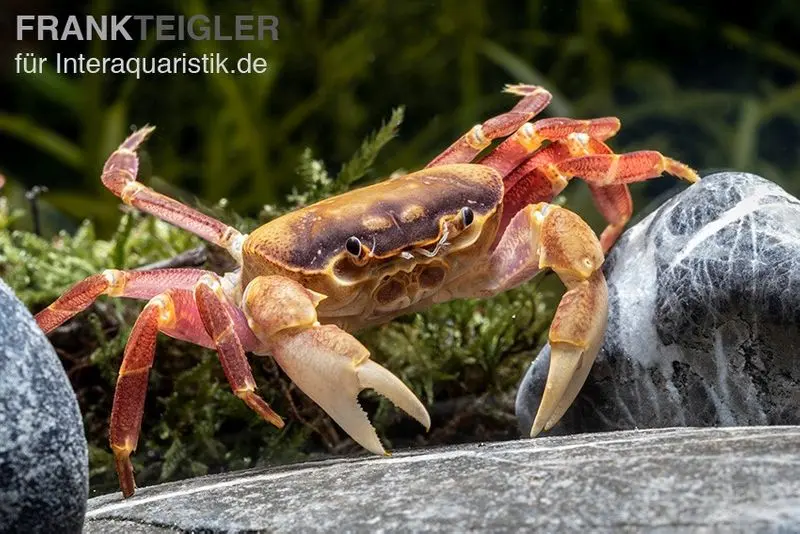 Die Orangenkrabbe, Sundathelphusa sp. "Orange", ist eine farbenfrohe Bereicherung für jedes Süßwasseraquarium und erfreut die Betrachter mit ihrer lebhaften Orangenfärbung und ihrem interessanten Verhalten. Wenn Sie auf der Suche nach einer farbenprächtigen und unterhaltsamen Ergänzung für Ihr Aquarium sind, sollten Sie die Orangenkrabbe in Betracht ziehen.