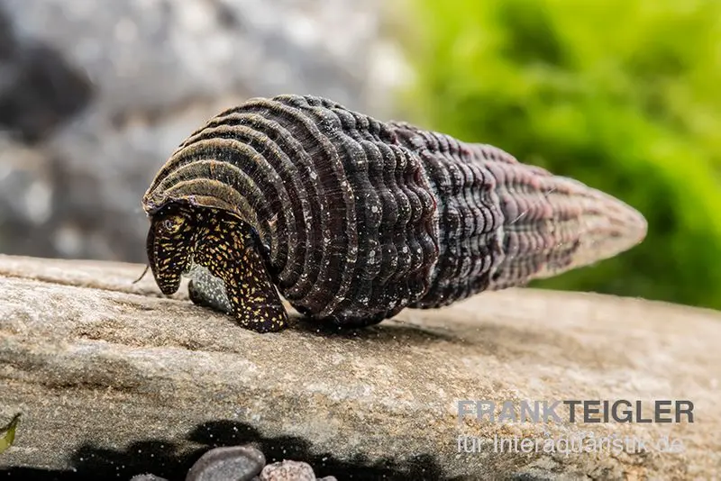 Die Matano-Mini-Tylomelania, wissenschaftlich Tylomelania spec. Matano mini, stammt aus dem Matano-See auf Sulawesi, Indonesien. Dieser See gehört zu den ältesten und klarsten Gewässern der Region und bietet einzigartige Lebensräume mit felsigen Böden und hohem Sauerstoffgehalt. Die Schnecke gehört zur Familie der Pachychilidae (Flussschnecken) und ist mit den bekannteren Tylomelania-Arten verwandt. Ihr auffälliges, dunkles Gehäuse ist tief gerillt und kann je nach Individuum leicht variieren. Der Weichkörper ist schwarz mit gelben Sprenkeln, was sie optisch besonders attraktiv macht.