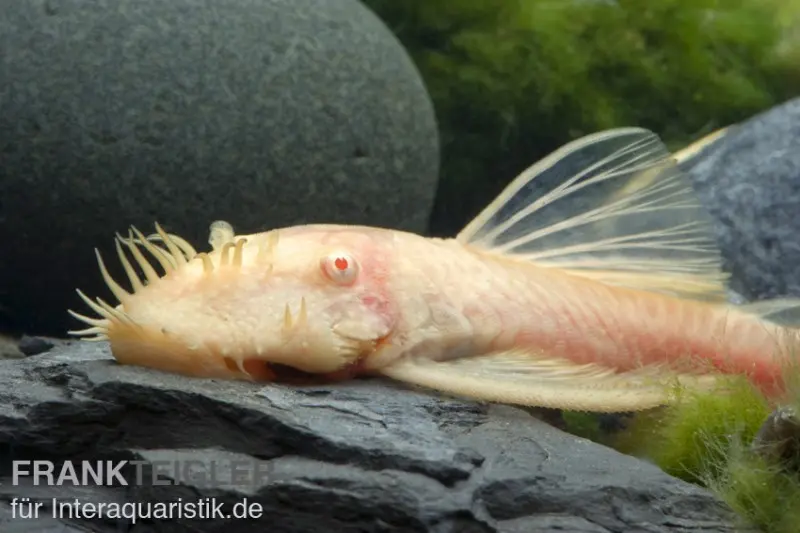 Der Goldene Antennenwels (Albino) (Ancistrus sp.) ist eine gezielt gezüchtete Farbform südamerikanischer Antennenwelse, deren Ursprungsarten aus dem weit verzweigten Amazonasgebiet stammen. Dort leben Ancistrus-Arten in langsam bis mäßig strömenden Flüssen, Nebenarmen und überschwemmten Uferzonen mit sandigem bis schlammigem Untergrund. Typisch sind große Mengen an Wurzeln, Totholz und Steinen, die nicht nur Schutz bieten, sondern auch eine zentrale Rolle bei der Nahrungsaufnahme spielen. Auf diesen Oberflächen wachsen Algen, Biofilme und Mikroorganismen, die von den Tieren aktiv abgeraspelt werden. Die Albino-Form ist eindeutig an den roten Augen zu erkennen und unterscheidet sich damit klar von gelben Linien mit dunkler Augenfarbe. Trotz der hellen Färbung zeigen die Tiere das vollständige, arteigene Verhalten ihrer wildfarbenen Verwandten und gelten bei artgerechter Haltung als robust und langlebig.
