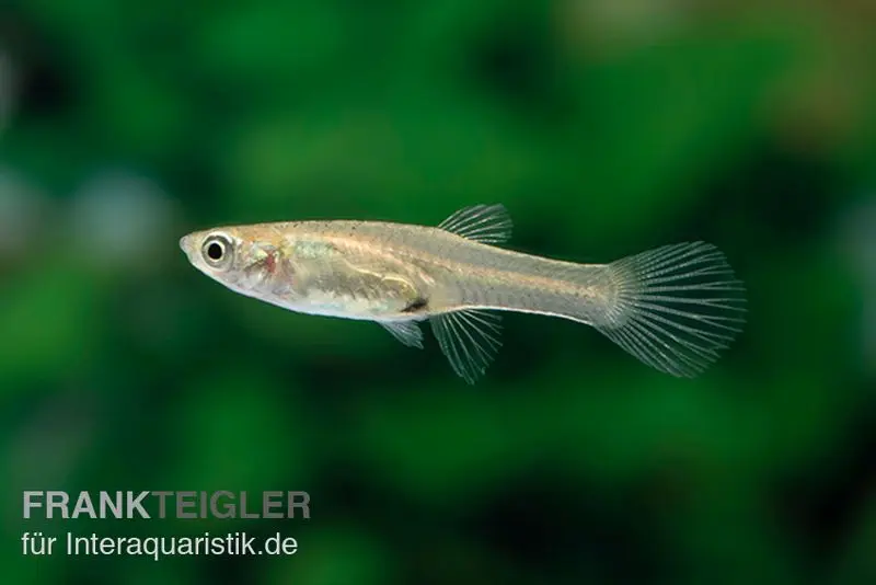 Männchen bleiben kleiner, wirken filigran und tragen die charakteristische Tigermusterung mit leuchtenden Akzenten. Weibchen sind deutlich größer, kräftiger und erscheinen silbrig bis blass. Das Gonopodium der Männchen ist früh sichtbar und ermöglicht sichere Geschlechtertrennung.