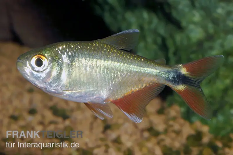 Der 6-8 cm groß werdende Hemigrammus caudovittatus (Rautenflecksalmler) wird auch Hyphessobrycon anisitsi genannt, der im Strömugsbereich des Rio Uruguay und Rio Paraná lebt sowie auch in verkrauteten Tümpeln zu finden ist. Der hübsche Salmler hat eine silbrige Grundfärbung mit gelben oder orangen Flossen, einen seitlich abgeflachten Körper und einen dunklen rautenförmigen Fleck am Schwanzansatz. Über die ganze Seite erstreckt sich ein irisierender Streifen, der bläulich schimmern kann. Bei Weibchen ist die Färbung der Flossen nicht so stark ausgeprägt, zudem sind sie etwas größer und plumper als die Männchen.