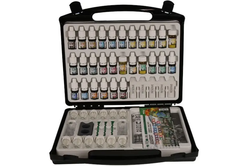 - Einfache und sichere Kontrolle der Wasserwerte von Aquarien. Bestimmung von: pH-Wert (3 Bereiche), Karbonathärte, Gesamthärte, Ammonium/Ammoniak, Nitrit, Nitrat, Phosphat, Eisen, Kupfer, Silikat, Sauerstoff sowie CO2 Errechnung über Tabelle.