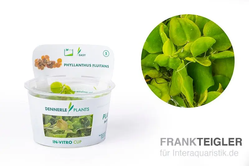 Phyllanthus fluitans wird in einem In-Vitro-Becher geliefert. Diese Form der Lieferung garantiert eine pestizidfreie und algenfreie Pflanze. Vor dem Einsetzen ins Aquarium sollte das Nährmedium vorsichtig entfernt und die Pflanze gründlich mit lauwarmem Wasser abgespült werden. Anschließend können die Pflanzen vereinzelt auf der Wasseroberfläche platziert werden.