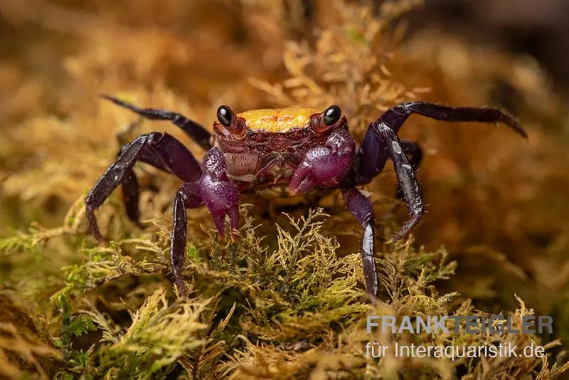 Der Name „Vampirkrabbe“ stammt von ihrer intensiven, oft violett-roten Färbung und den auffälligen, dunklen Augen. Diese Kombination erinnert an klassische Darstellungen von Vampiren und macht sie zu einer der faszinierendsten Krabben im Hobby.