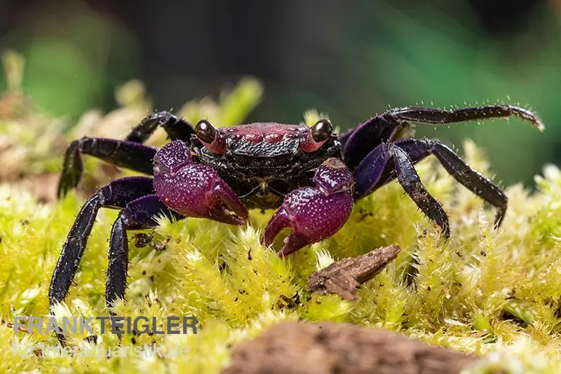 Der Name „Vampirkrabbe“ stammt von ihrer dunklen, mystischen Färbung und den oft leuchtenden Augen. Trotz ihres Namens ist sie völlig harmlos und bevorzugt kleine Beutetiere sowie pflanzliche Nahrung.